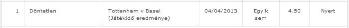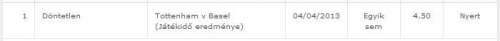 Várható nyeremény: 4200 FtKöszi Tottenham... fél óra alatt nem tud bemakkolni egy tetves gólt...