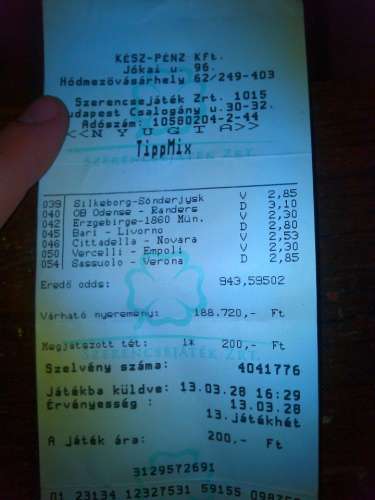 Szóval elhúzok kocsival, bemegyek először mondja a nő nincs szelvény várjak egy picit.. várok ad, majd kutatom a zsebeim pénz megvan, de nincsenek meg a felírt számok na mondom bazz.. húzás haza, megírom otthon a szelókat, megyek vissza, az út 3/4 nél észreveszem otthon maradt a pénztárcám a jogsival stb, na mondom csak visszahúzok végül 3. ra sikerült feladni a szelót.