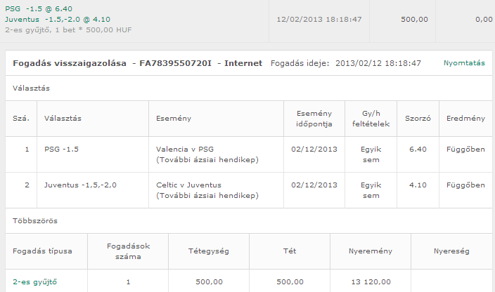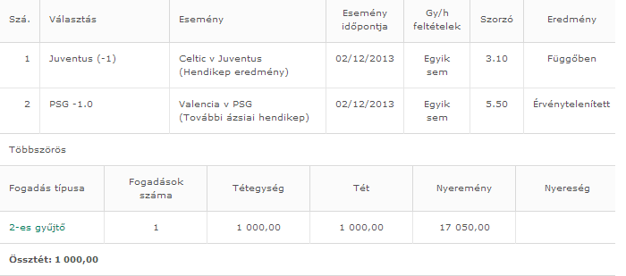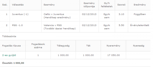3-as gyűjtő, 1 bet * 4 000,00 HUFMan Utd 0.0,-0.5 @ 1.90