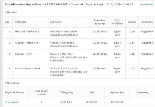 4: Nyer a hazai csapat, akkor jön 5K -1k a most megjátszott szelvény, -1k az eredeti, -1k a két döntetlen, 2k haszon.Így utólag nézve rakhattam volna máshogy is, de már mind1. Én bízom az arsenal győzelembe.