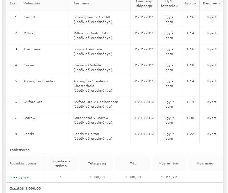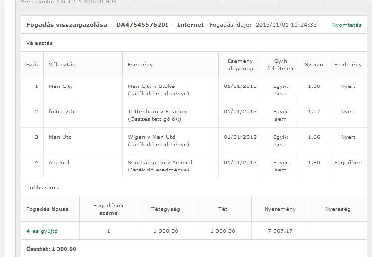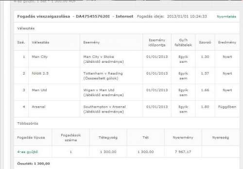 1: Sima Arsenal győzelem ~8K jön, - ez a 2K fogadás bukó - a megjátszott 1k tét = tiszta 5K haszon