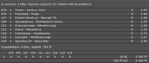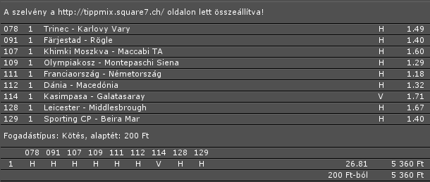 hallottam már sokszor hogy valaki tippmixből él. egy kis kezdő pénz kell hozzá meg 1-2 meccsnél nem szabad többet tenni 1 szelvényre. mindenki rinyál, hogy mindig 1 meccsen megy el a szelvénye. tedd meg mindegyik meccset külön szelvényekre, és akkor nem olyan sokat, de legalább nyersz. mert megraktok pl 5 meccset egyszerre, és abból elmegy 1. vegyük úgy hogy mindegyik meccsnek 1,5 a szorzója. és mindegyiket megrakod egy ezressel. 4 meccs bejön, 1,5*4 az 6000 Ft, 1000 Ft plusszba vagy. ez változó persze, lehet hogy a 2,7es szorzós meccs jön be akkor már jóval több a plusz. de ha 5 meccsből 1 jön csak be akkor se gáz mert legalább maradt pénzed, és lehet hogy másnap szerencsésebb leszel és abból a maradék pénzből meg nyersz többet. próbáljátok ki ezt is. kedden buktam a liverpool miatt, tegnap váltottam taktikát. megraktam hogy everton nyer, 2,25ös szorzóval, 3000-el. a chelsea meccset éreztem hogy bukta lesz, nem raktam meg, ezt tegnapelőtt írtam egy fórumon: "2013. jan. 01. 21:23 |