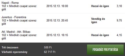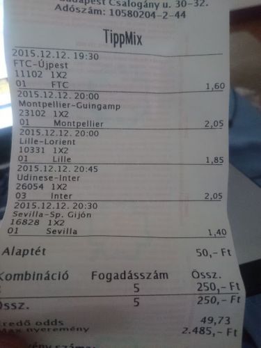 ,bár nekem már mindegy a milan kilőtte a másik szelóm.Azért szeretnék egyszer egy tényleges levezetést elolvasni valami szakitól,hogy miért is van az a teljesen lehetetlen helyzet,hogy mindegy hány szelót adsz fel,de 1 mindig elmegy.Mindenki ismeri aki itt megfordul,feladsz 3x4 meccset ,általában mindegyiken 1 megy el,persze most nem extrém fogadásokra gondolok.Tehát adott 12 mérkőzés és teljesen mindegy,hogy kavarod nem bÍrod úgy feladni ,hogy 2 szeló jöjjön a 3.-on meg elmenjen 3 meccs.99%-ban mind a 3 szelvényre jut egy bukó