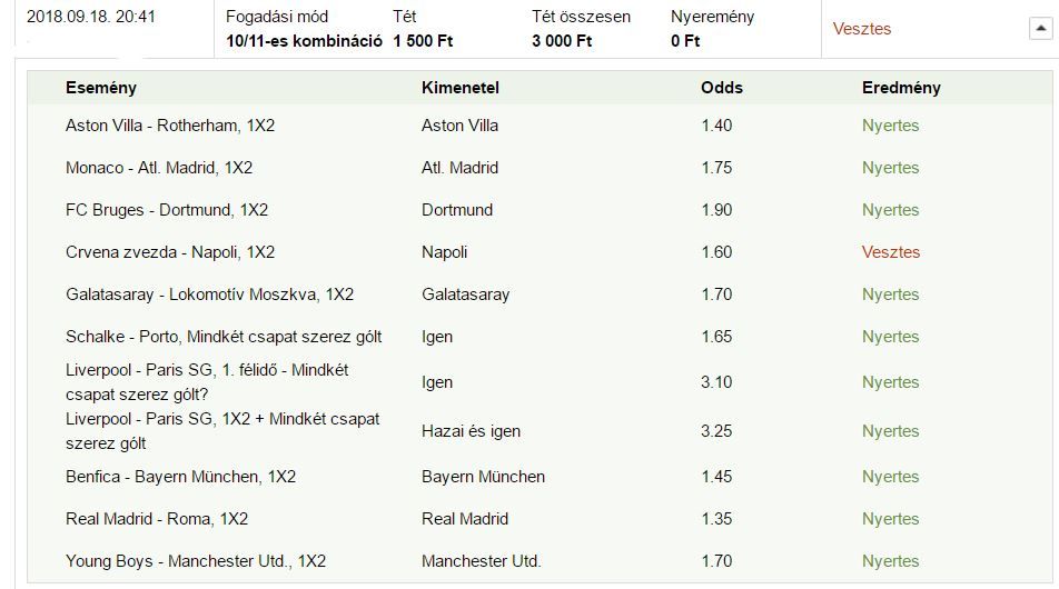 Bayern nem nyer kötésben ManU nem nyer 10x biztos volt minimumLátod két nap alatt nem is olyan ritkán jöttek nagy oddsok. Azon gondolkoztam a szünetem alatt, úgyis 500-1000 forintokkal játszogatok, nyerek építkezve egy ötezrest és dupláznám egy meccsel tízezerre nem érzem meg és gyakran elmegy papírformán, akkor inkább játszós szelvényeket és várni a sült galambot jön valami 30x tipp? Nem tudom mi a jó.