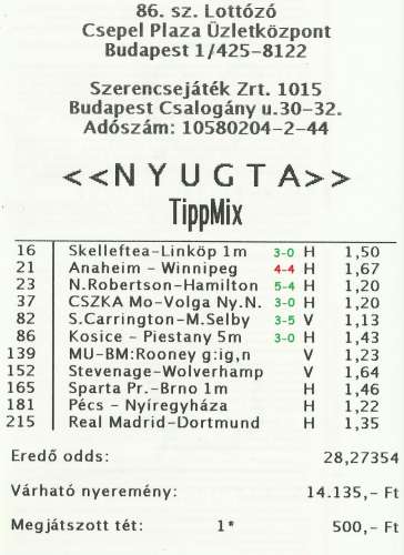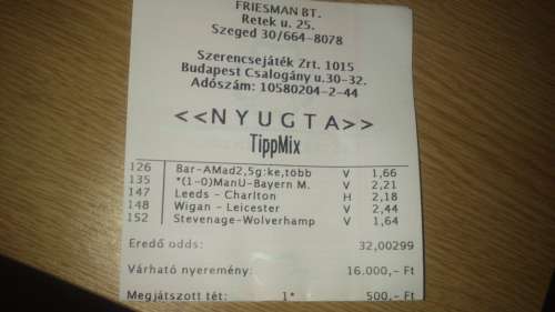 -15k, lottózóba mondták, hogy a Bayernt 500 ezerrel tette meg valaki 5 szelvény 100 ezres, a lottózós csaj mondta nekem, mert megkérdeztem, igaz ami igaz, én elhiszem hogy megtették annyival, nem lennék a helyébe.