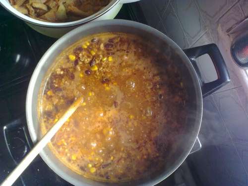 giigz... először ez volt a recept, de ezt itt-ott picit módosítottam a saját ízlésünk szerint, lényegében csak annyiban különbözik ez a sajáttól, hogy a bab és kukorica konzerv, így csak a legvégén kell beletenni, körülbelül 10-15 perccel a vége előtt, hogy csak összerottyanjon