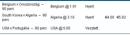 + mondtam nagy tétest csoportkörig nem akarok rakni, de egy USA - Német 1.70-es oddsért nem rossz, lehet 30 ezerrel megrakom, 50 körül hozhat, de ezt még ráérek eldönteni mert csütörtökön lesz...