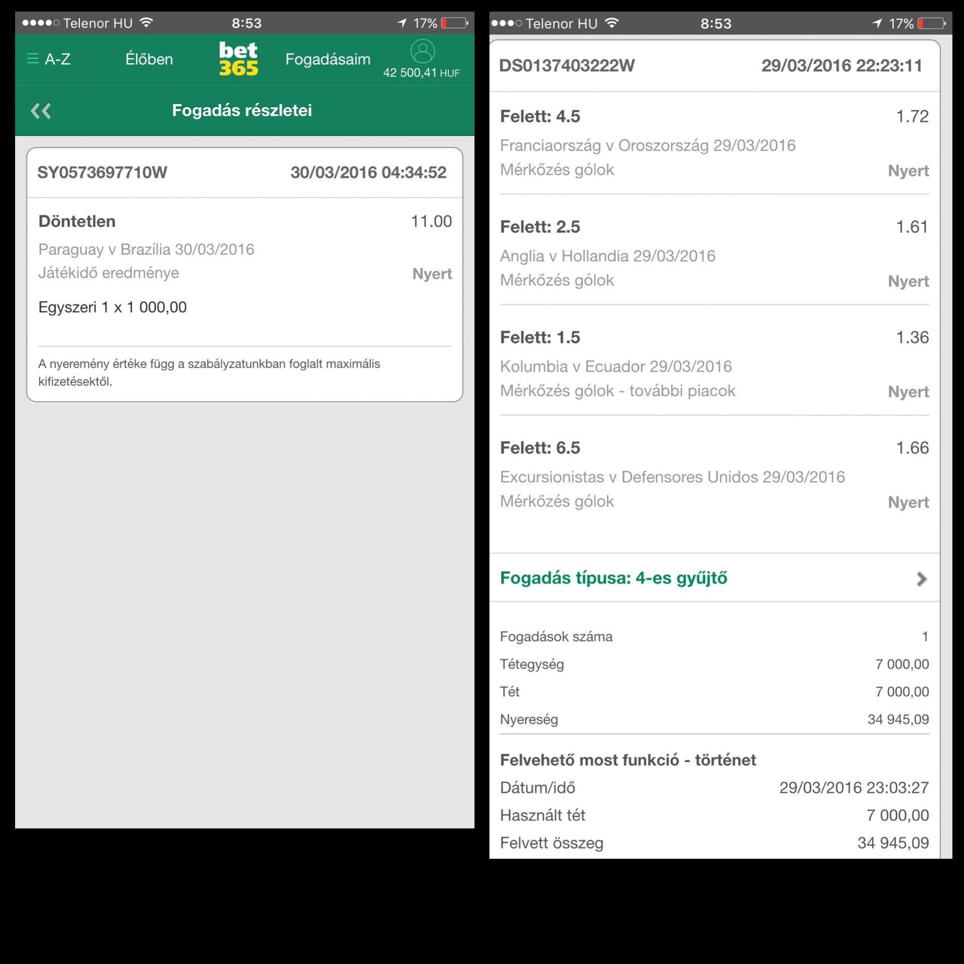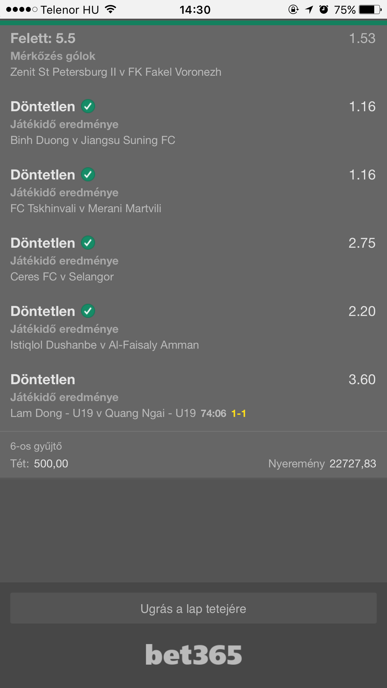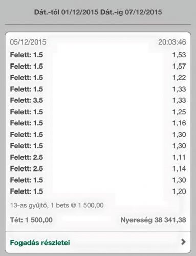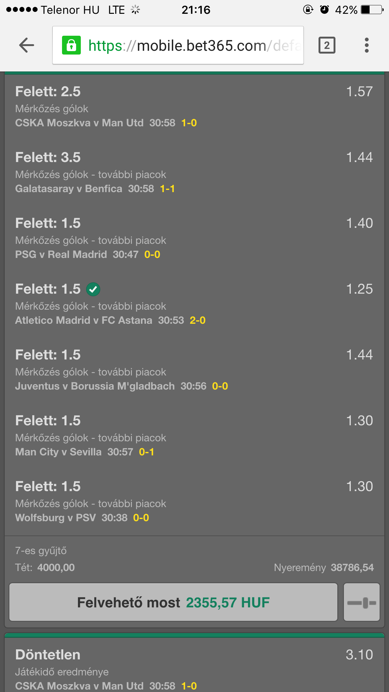 Sahtar Doneck v. Anderlecht 1.5gól felett. (nyert)Oké, hello 10.000,- Gondoltam visszahozom "legalább azt amit buktam, a következőket is megtettem 10.000,-el.