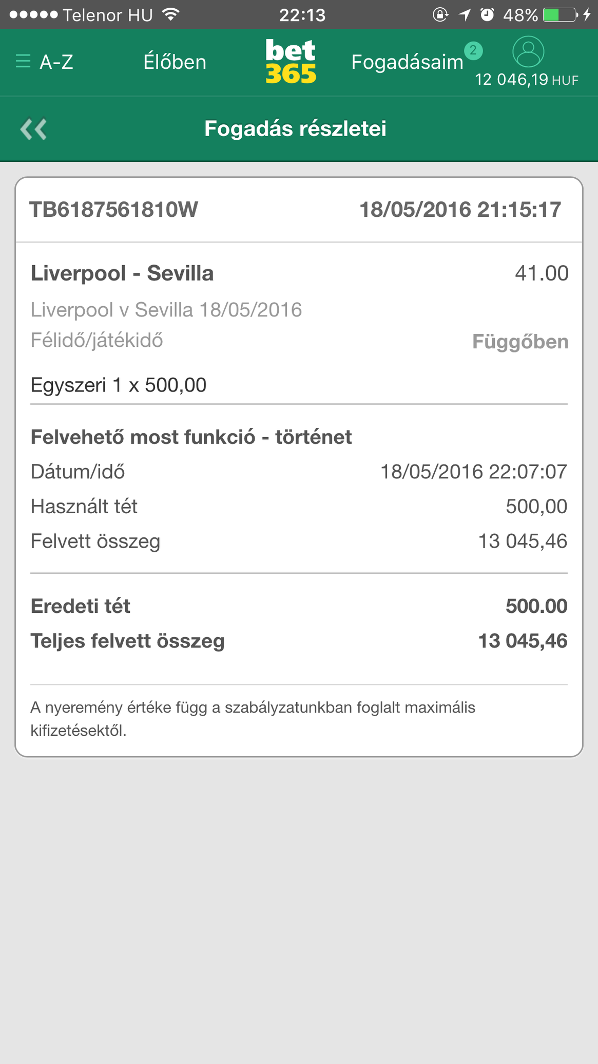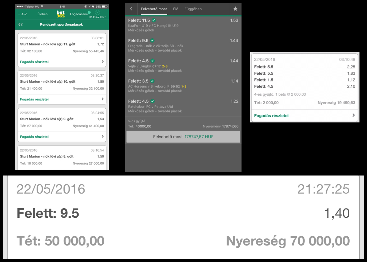 Amint a megrakott osszeg fole megy Beten, mar ki kellene vennem (jo persze nem akkor ha 45. percnel jarunk, hanem a vegehez kozeledtevel, nem szabad hagyni hogy a megrakott tet ala menjen az eppen kiveheto osszeg! (Persze ha mar addig felment mert alapbol nem tudunk annyit kivenni mint amivel fogadtunk, csak ha jott mar X meccs). Magamban mindig megfogadom hogy igy csinalom, es bar lassabban gyarapodna a penzem de gyarapodna, de a mohosag ugye, hogy hatha jon az egesz, es akkor szazezrek....