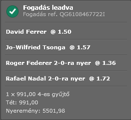 szépen eltaláltam, hogy Ferrer az utolsó game-et 15-re fogja megnyerni, 2,87-ért raktam, bár csak egy ötszázassal... de előtte egy olyat is elcsíptem, hogy semmire hozza a szerváját, nagyjából hozott tiszta ezerötöt a meccs, jó az