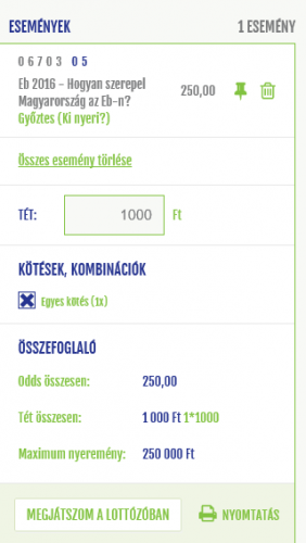 Az ilyeneket ne papiroson tedd mert ott levan tiltva minden olyan meccs/végfogadás kombináció aminek esetleges eredménye a másikra is kihatással van... Pl most a csoportmeccsek első fordulóját engedi csak, hiába akarnék én német csoportmeccsekből kettőt tenni, bepirosodik letiltott kombinációval.