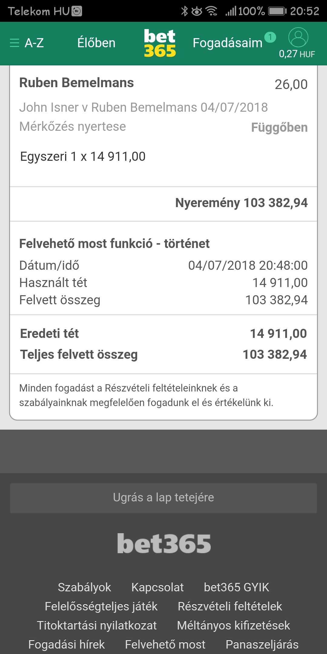 Cigiztem parat + kave, mert megyek dolgozni. Nezem 85. perc, 2-1 meg mindig. 6720 Ft-ot engedett felvenni.