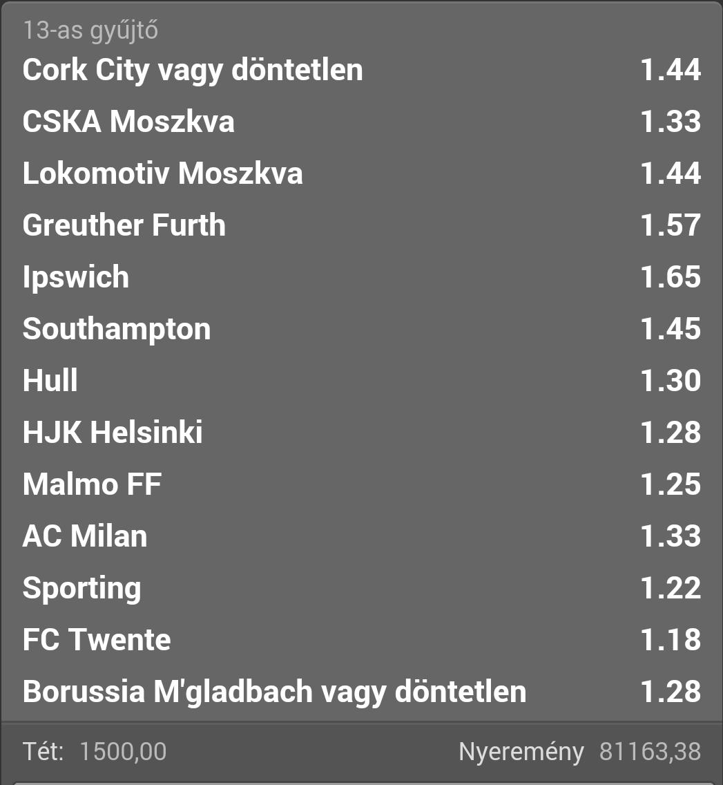 Eddig egészen jól alakul a szelvény, még szerencse hogy a két általam legneccesebbnek gondolt meccset a Cork City-t és a Mönchengladbach-ot is x1-be tettem, mindkettő az utolsó pillanatban mentette.