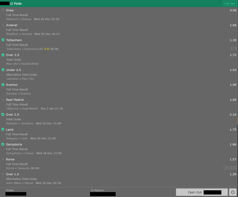 Szerintem cash-out lesz belőle hamarosan, mert igazából nem érzem az esti Watford-Chelsea-t igazán, illetve félő, hogy idegekkel sem fogom bírni. A Realt meg csak véletlenül raktam bele, azt hittem, ma lesz a meccs.