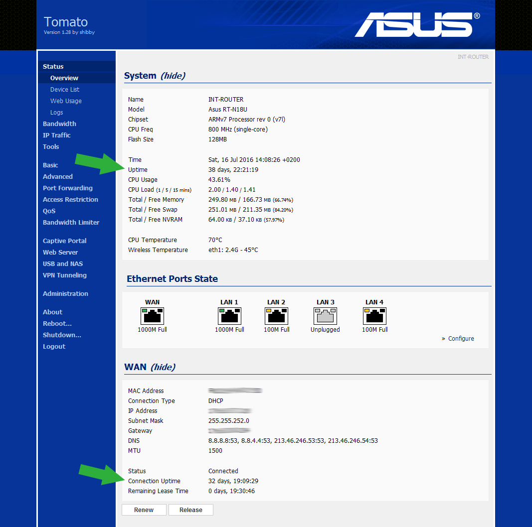 Ne keverd a verziószámokat! Az 1.28 a fő verzió, ez tudtommal sok-sok éve változatlan, azon belül a Shibby buildnek is van egy saját verziószáma, ami jelenleg 137-nél tart. [kép] De a 137-est én nem nagyon ajánlom, sajnos a MultiWAN rész egy kissé bugos, emiatt inkább a 132-t szoktam javasolni, jómagam is ezt használom az Access Pointként funkcionáló RT-N12 D1-emen. [about] [status]