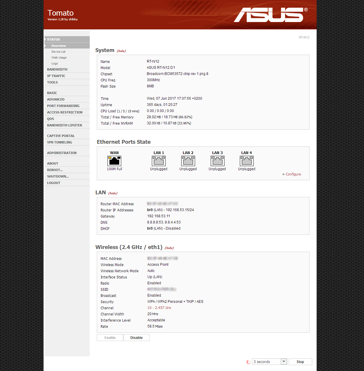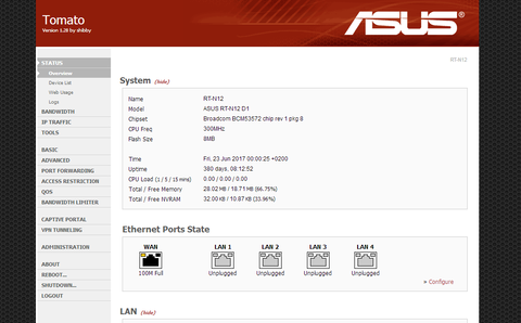 Nos, 410 nap uptime után feltettem a 140-es Tomato-t, és mivel jelenleg nincs rá szükség, leállítottam az RT-N12 D1-et. De szépen állta a sarat több mint egy évig egyhuzamban.
