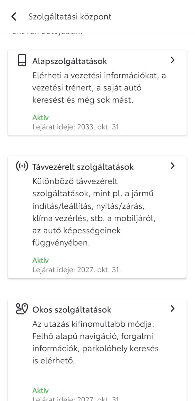 Az app-ban látszik, hogy mi meddig ingyenes. Utána kell előfizetni, ha kell továbbra is az adott szolgáltatás. Nekem 2023 októberi a gép, onnantól aktívak ezek a szolgáltatások.