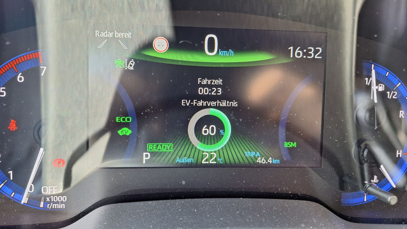 ma hazafelé a dugóban pl 30 perc volt az út, abból 15 percet elektromosban gurult, vagyis inkább araszolt. mert a dugóban is megy a tempomat én csak néha bökök a gázpedálra ha nem indul meg a hosszabb várakozás után. azaz én próbálok minnél többet az elektronikára bízni.