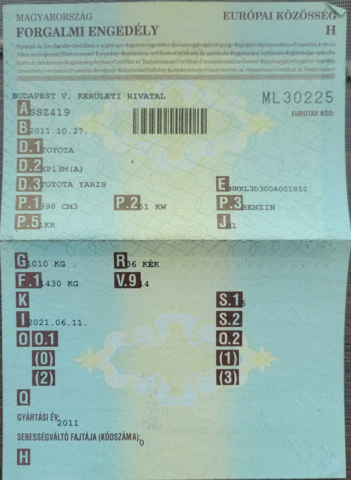 Rendszam RVL-135048 Egyéb záradék: hajtóanyaga helyesen (P.3): Ólommentes benzin. 048 Egyéb záradék: környezetvédelmi osztályba sorolás helyesen (V.9): 14-715/2007/EK I. táblázat szerinti (EURO-V), Otto-motoros. 048 Egyéb záradék: járműjelleg helyesen: AB-Ferdehátu limuzin 048 Egyéb záradék: Másodlagos jelleg helyesen: 000000 048 Egyéb záradék: Járműtípus-variáns helyesen: B5P11-M52BZ1 048 Egyéb záradék: sebességváltó típus helyesen: 0-Fokozatváltó (5 fokozat) 059 Motorszám helyesen G3LADPR00543 048 Egyéb záradék: Típusazonos motorcsere: Új motorszám: G3LADPR00543.