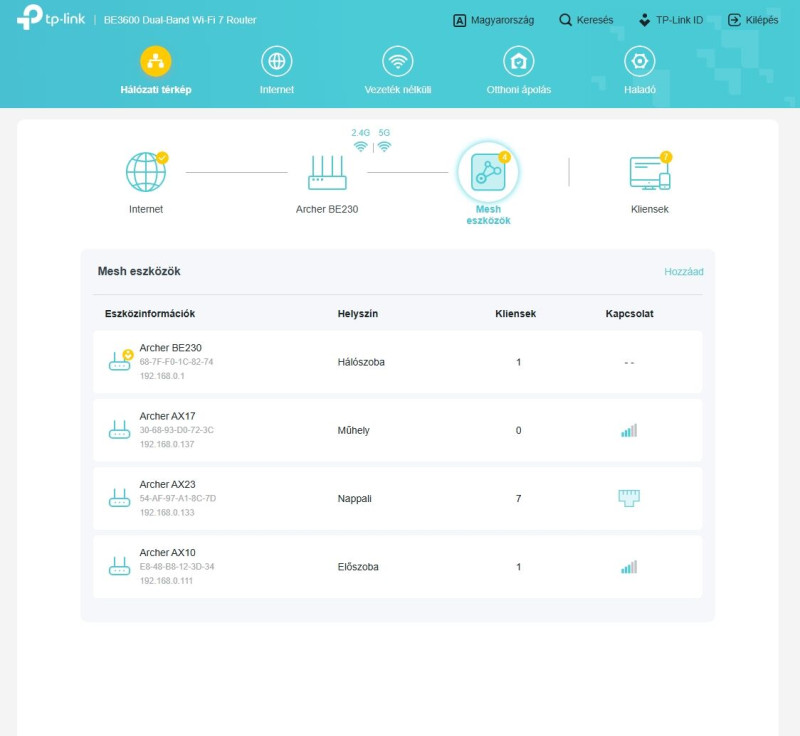 A hálózatomban csak Tplink eszközök vannak. Több sima és poés swich mellett a főnök egy AX73 router. A kerben van egy AX50, és a lenti szinten egy 605x v1.2