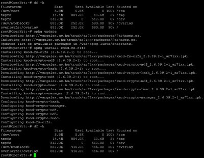 * opkg_conf_write_status_files: Can't open status file //usr/lib/opkg/status: No space left on device.Illetve mi az amiket ellehet távolítani, és nem okoz hibát a működésben (hátha nyerek elég helyet a kmod-fs-cifs-nek) ?