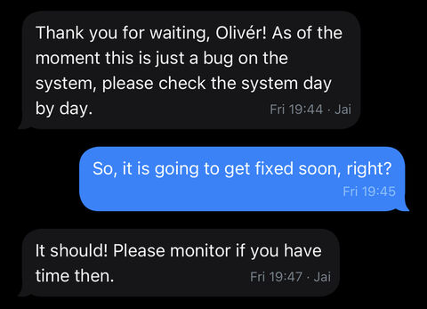 Jai (ügyfélszolgálatos): Köszönöm, hogy vártál, Oliver! Jelenleg ez csak egy hiba a rendszerben, kérjük, ellenőrizd a rendszert napról napra.