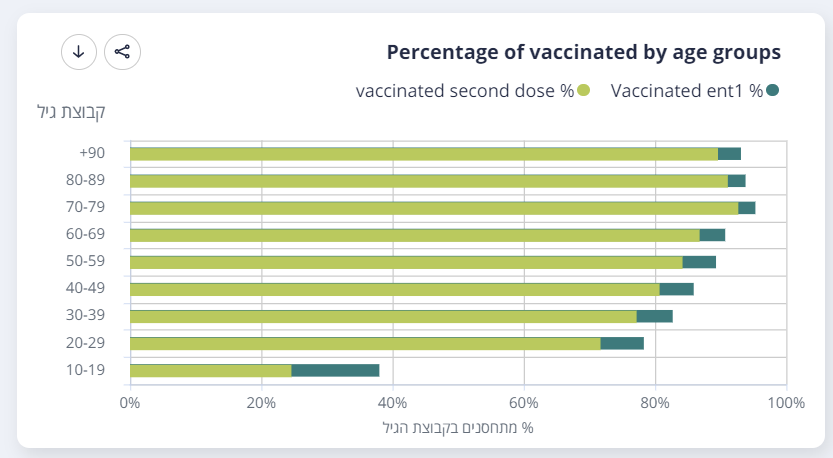 Viszont Izraelben 38%-a kapta meg az első adagját a 10-19 éveseknek (ami igazából ugye 12-19 évesek, mert 12 alatt ott sem oltanak tudtommal). 24.6% pedig mindkettőt.