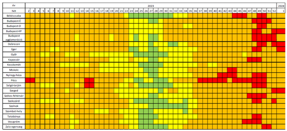 "2024. első hetében a szennyvíz SARS-CoV-2 örökítőanyag koncentrációja országos átlagot tekintve stagnálást mutat. Az egyes mintavételi helyek többségében szintén stagnálást mértek. Emelkedés Egerben és Pécsett tapasztalható, csökkenés Békéscsabán, Budapest Dél-pesti Szennyvíztisztító Telep ellátási területén, a vizsgált budapesti agglomerációs településeken, valamint Nyíregyházán, Szekszárdon és Veszprémben látható. A szennyvíz SARS-CoV-2 örökítőanyagának koncentrációja négy mintavételi helyen a magas, míg a további 18 helyszínen az emelkedett tartományba esik."