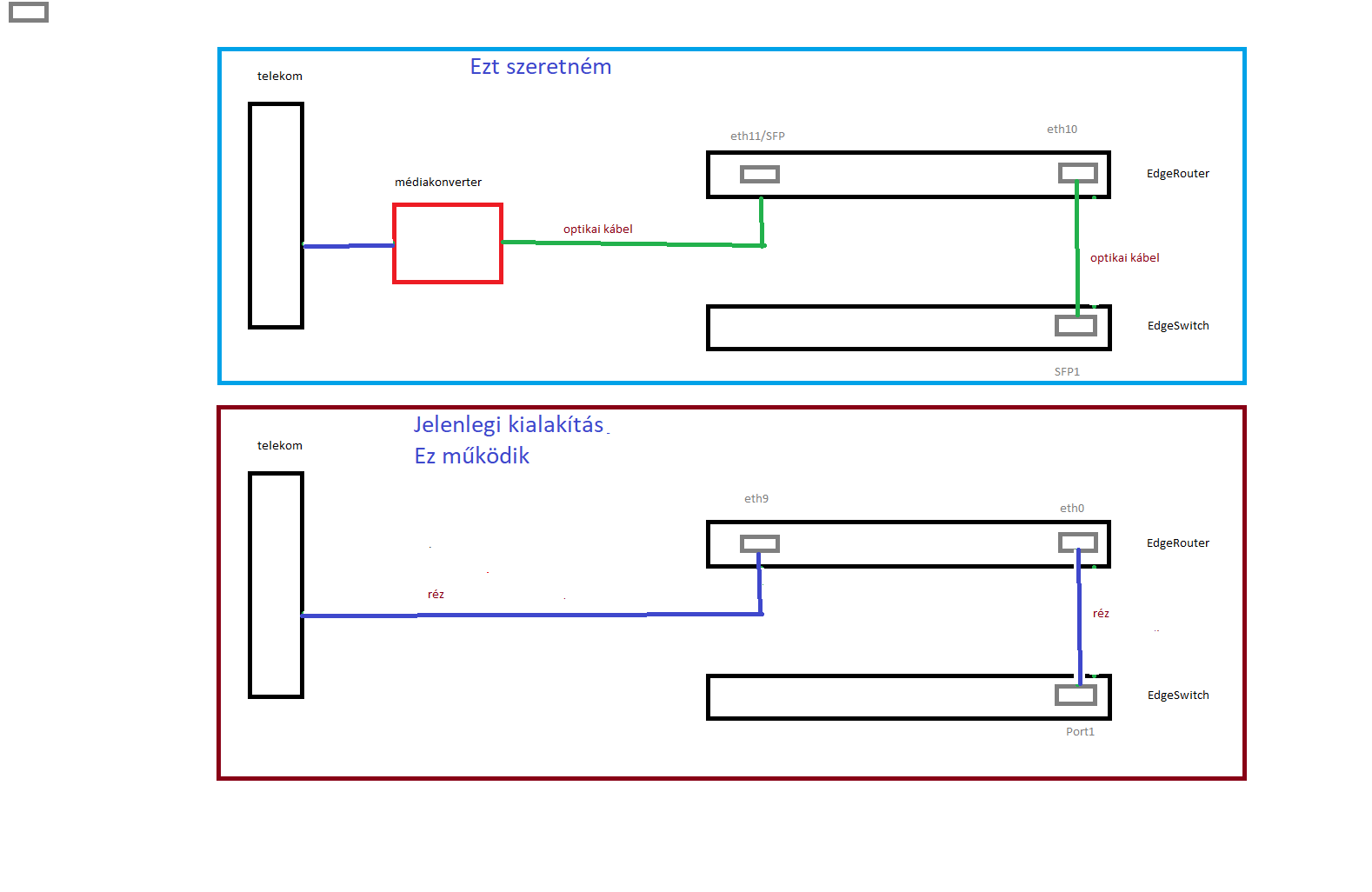 Majd kihúzva az eth9 internetkábelt, azt bedugva a médiakonverterbe, majd a konverter optikai kábelét bedugtam az SFP portba.