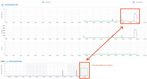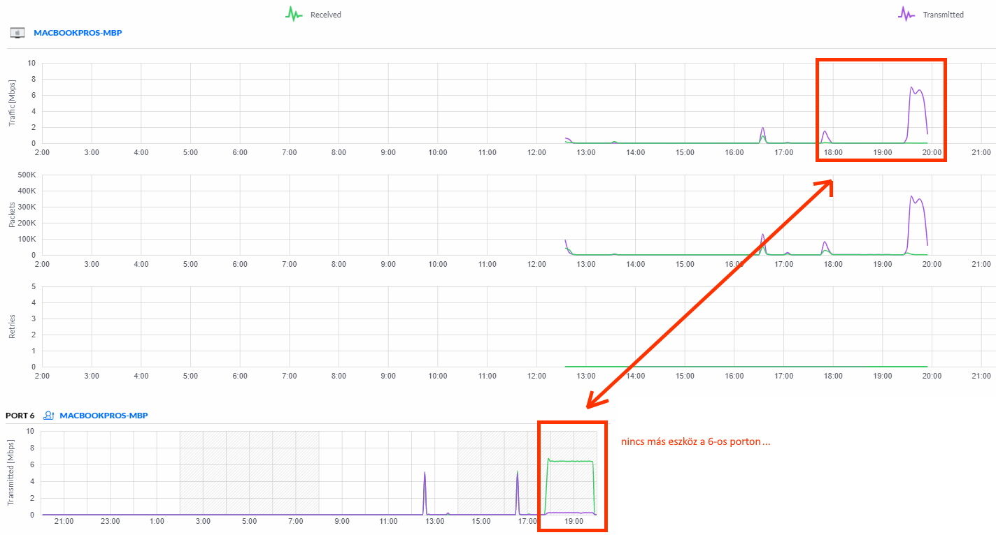 az eszköz a 6-os portra volt csatlakoztatva UTP kábellel. Az alsó grafikon a helyes, amit a Statistics > Switch stats oldalról vágtam ki. A felső grafikon a client historical data aloldalról van. Mindkét grafikon 5 perces időközre lett beállítva.
