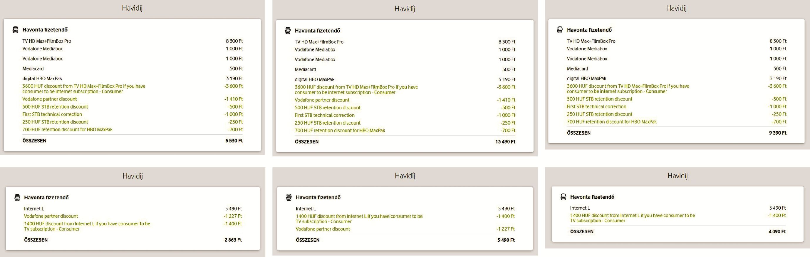 – végül pedig milyen árak láthatók most a My Vodafone fiókomban (3. oszlop): vicces, hogy itt még mindig nem stimmel a tv-előfizetésnél a végösszeg, ha összeadjuk az egyes tételeket.