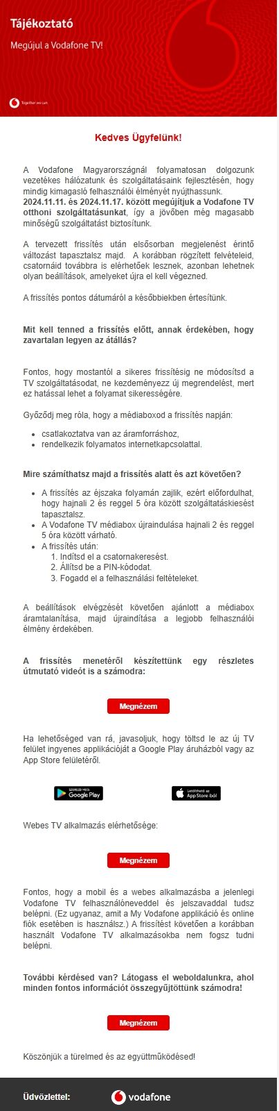 Szevasztok, az előbb kaptam vodától mailt, tizenkilencedikétől pár csatorna száma megváltozik. Ha kell hangoljam újra a Tv t. Frissítésről még semmi.