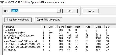 Király, ugyan a sima pinges nem hozott eredményt, minden rendben volt, de a WinMTR már kiszúrta a hibát: