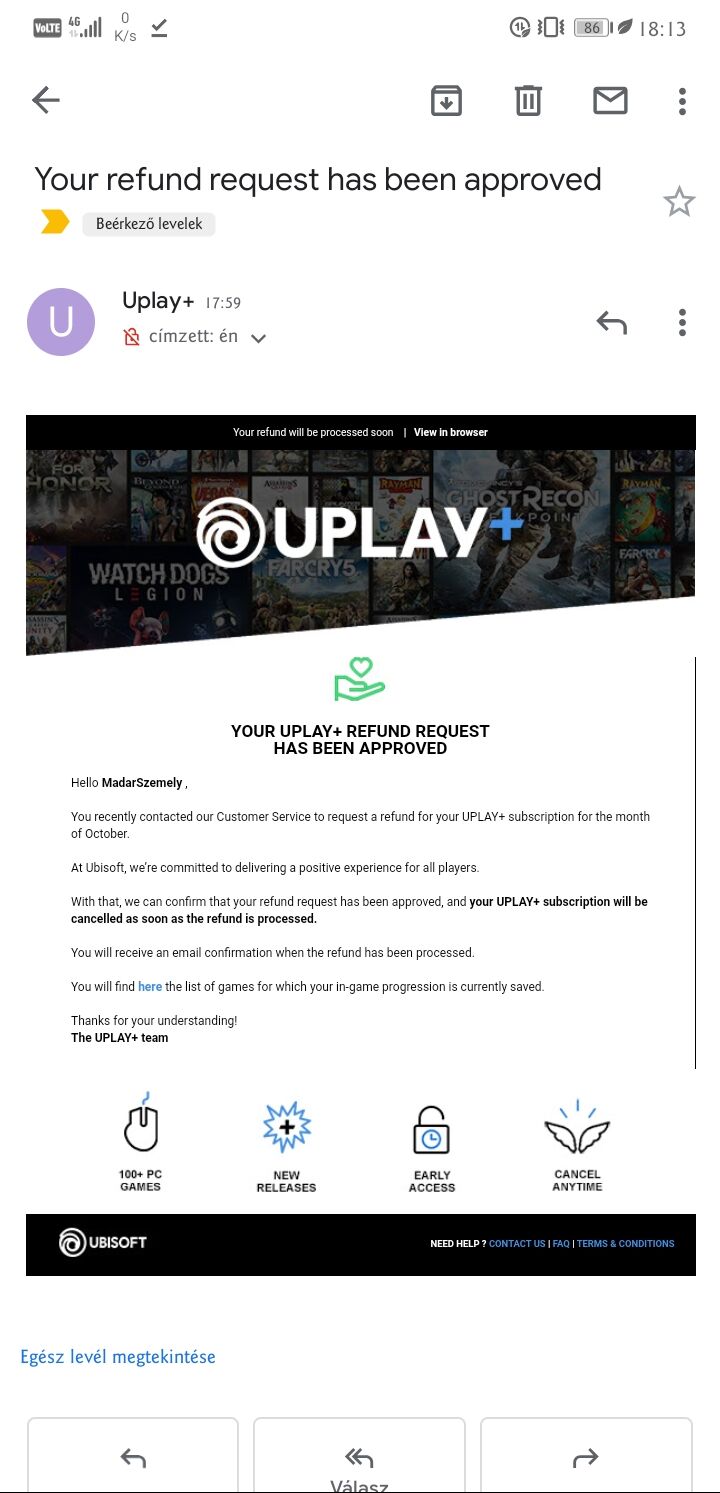 Nem bírtam magammal és írtam egy szép válaszlevelet Petarnak, amiben megemlítettem, hogy csoportos per indításán gondolkozunk az Ubisoft lekezelő magatartása és az időszakosan ingyenes szolgáltatásként reklámozott uplay+ miatt. Ma reggel visszakaptam az 1 eurot a Revolut kártyámra