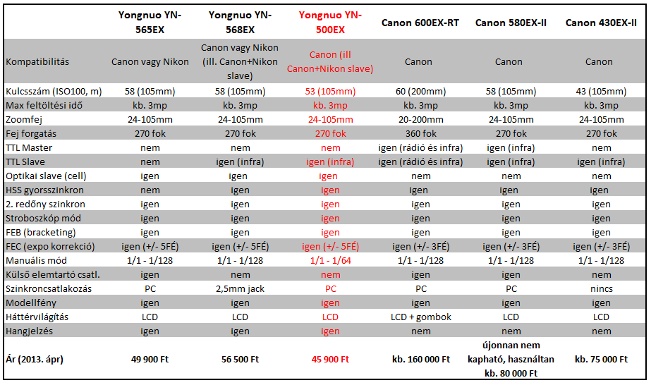 Az 565 (meg az 568, a Canon 600EX, 580EX, 430EX) és az 500 összehasonlítása meg ITT van.
