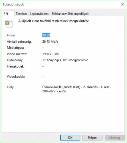 Ez egy Full HD kamerás felvétel, nem sért senkit igazán. Egyedül a Windows Media Player képes kiírni, hogy mekkora bitrate a felvételnél, ott 26.43 Mb/s-et ír.