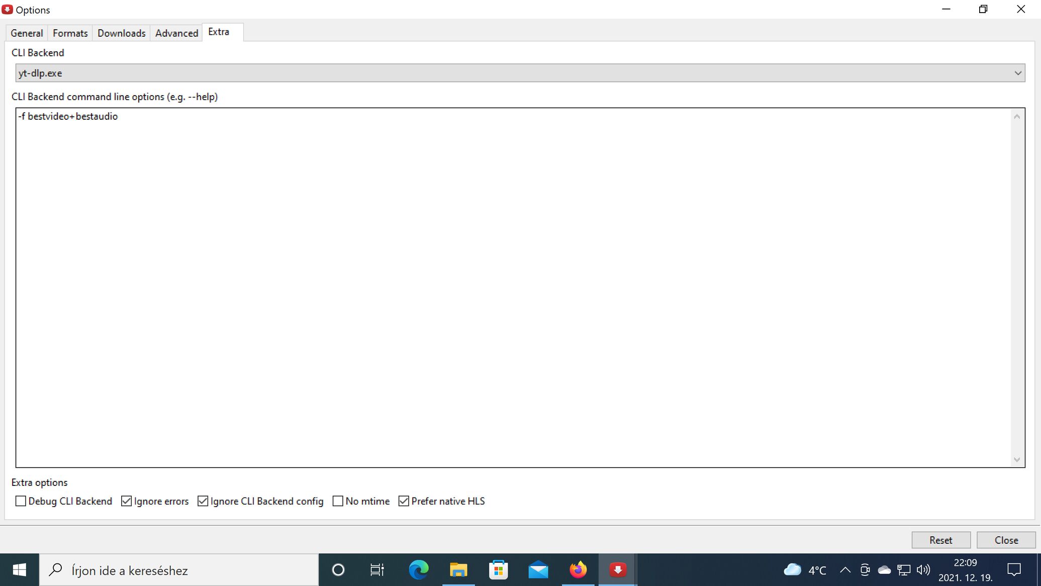 3. Az Options részben menj az Extra fülre, aminek a CLI Backend command line options (e.g. --help) részébe írd be ezt a parancsot:-f bestvideo+bestaudio(Ezzel a paranccsal van arra utasítva a program, hogy Pl. YouTube-ról a legjobb kép és hangminőséggel töltsön le)