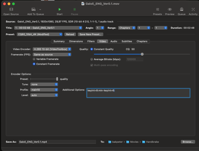 handbrakes verziónál figyelj a keyframere, mert azt hinné az ember hogy egy gyári beállításos x265öt simán visz az M1 aztán egy frászt... a 250 keyframe kivégzi a gépet.