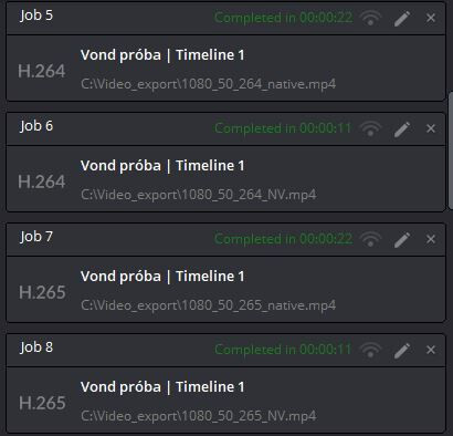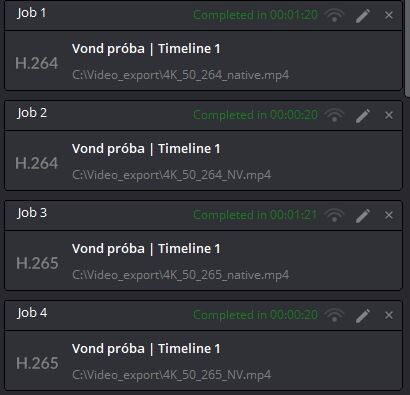 GTX970 NVIDIA GPU render 2:37 CPU 15-20%, GPU 55-100% között itt is.Végeredmény mérete: Native render 537MB, NVIDIA render 824MB. A kisebbik filenál érdekes mód a 12000-es limit ellenére 8000kbps -t ír a lejátszó csak, és nem látok eltérést a minőségben.