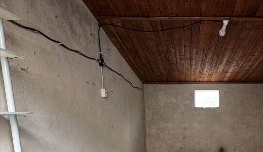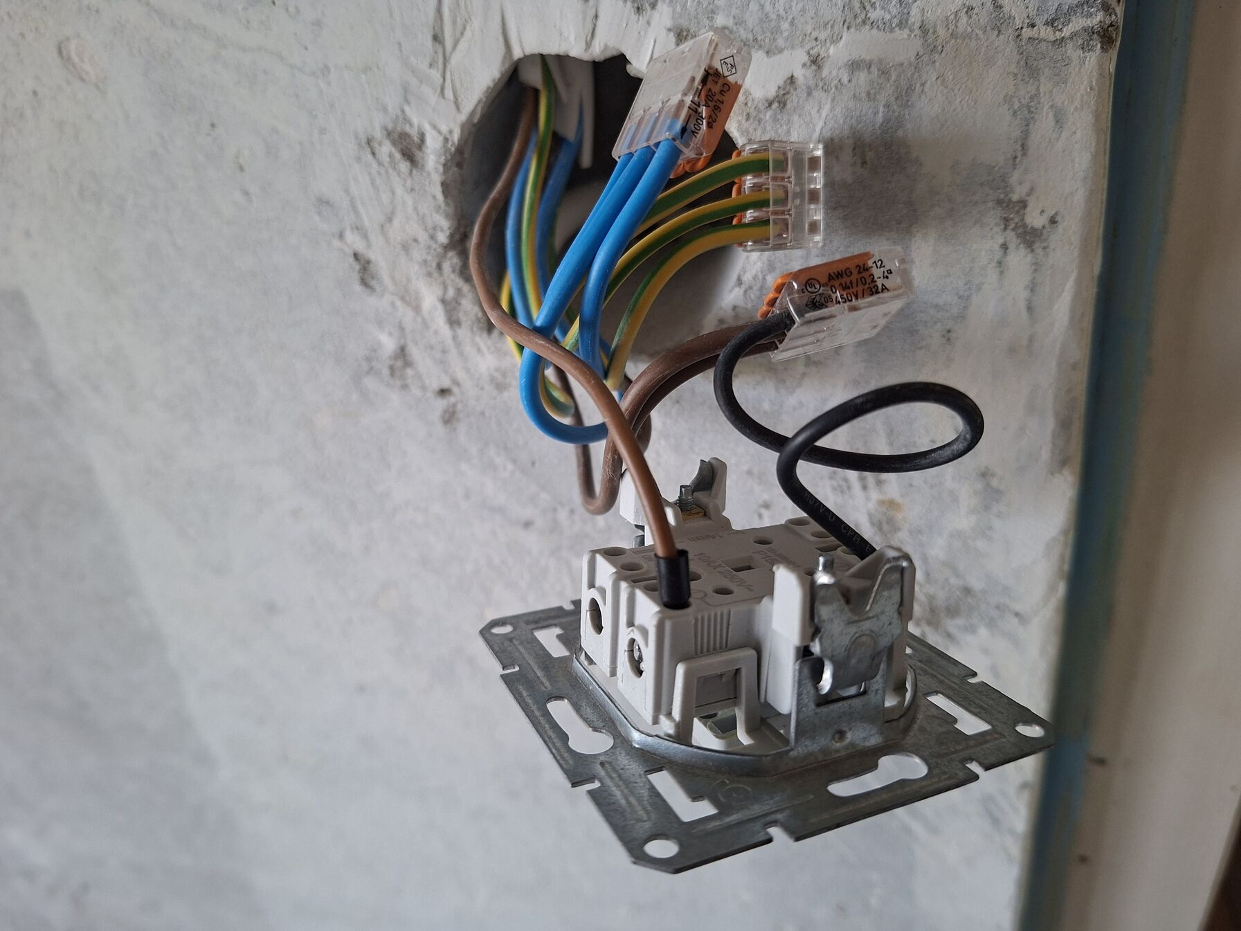 Ilyen most. Ennek az egyik része még alumínium vezeték a másik része 3x2,5. A dobozban nagyon csúnya bekötés van, ami a képen nem látszik. Az ott hátul a másik dugalj... helye! Ugyanis letörték és ott hagyták "lógva" a vezetéket.