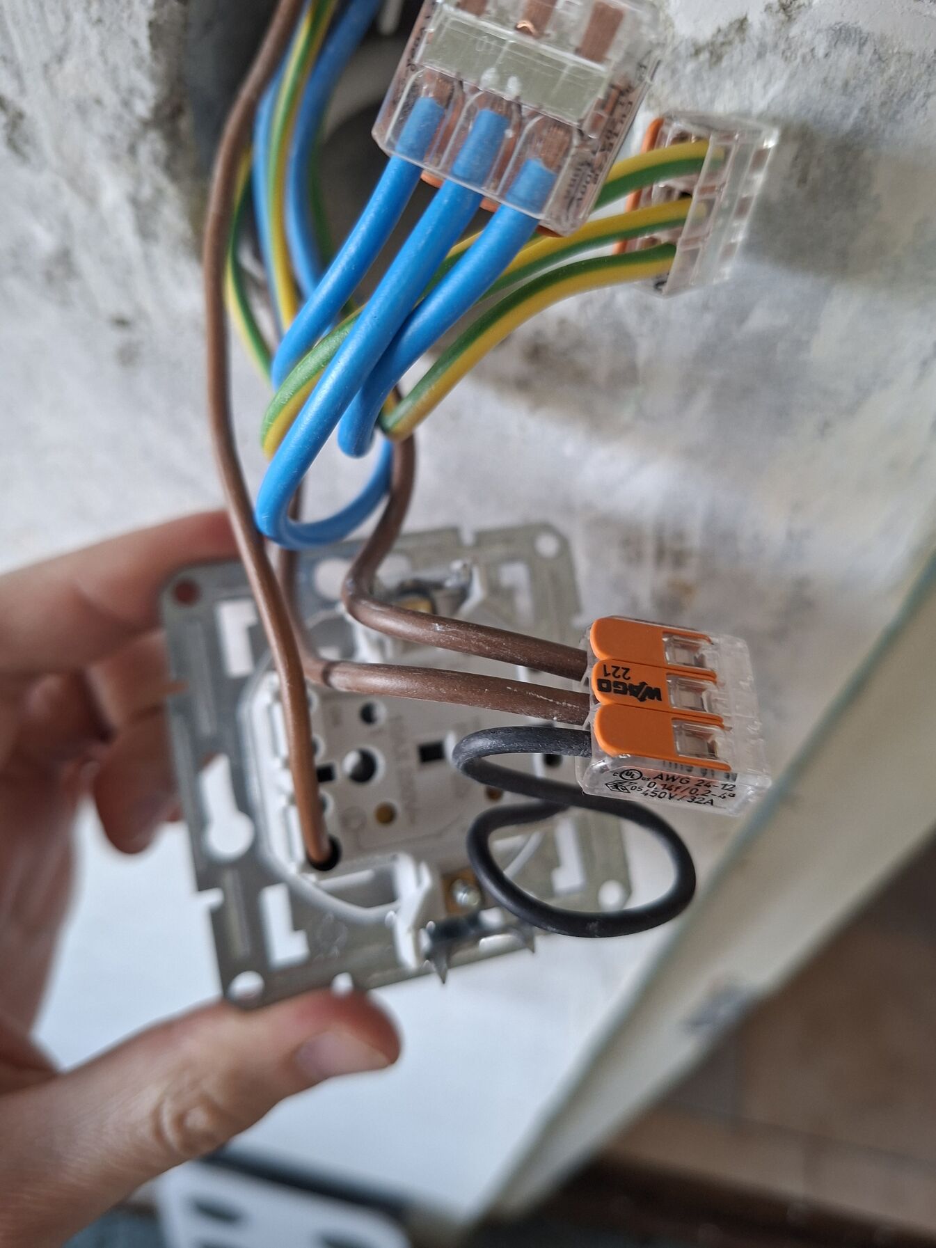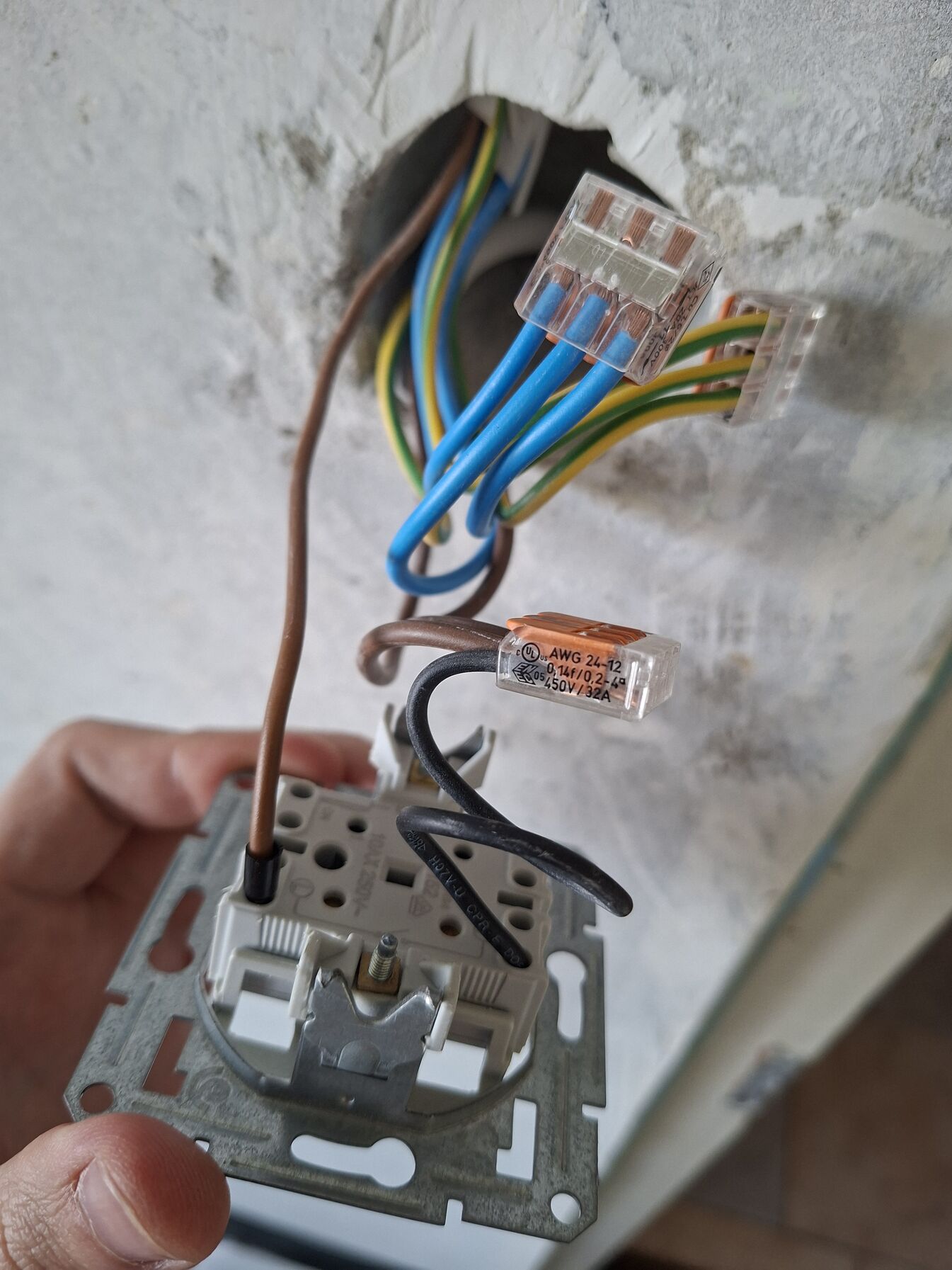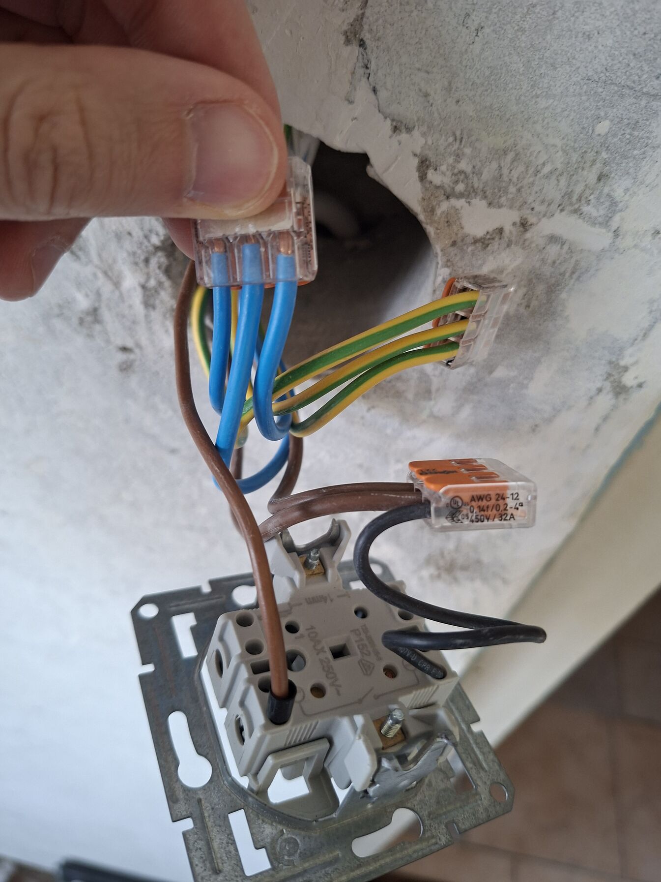 Az hogy a wago-ból húzott vezetéket a kapcsolóhoz, az is elfogadott megoldás.Visztont most ki van szedve a falból, így a visszahelyezéskor a karmok becsavarásakor tapaszalt odafigyelést igényel, nehogy a vezetékeket megsértse aki visszaszereli. Tehát összességében még nem üzemeltethető, mert nincs visszaszerelve a kapcsoló.