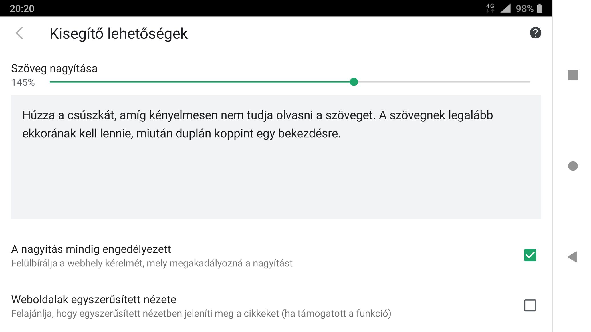 A mobilos valtozatban, ha bekapcsolom a kisegítő lehetőségben a nagyítást (pl. 120%) elcsúszik az érintés. Tehát ahova az ujjam teszem nem ott keletkezik az erintes. Mintha (checkbox, textbox) melle mutatna az ujjam. 100%-nal jo a működés. Ezt a funkciot hasznalom a chromban es ott rendben van. Másnál is van ilyen jelenség?