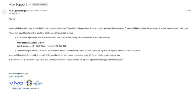 Szeretnénk ugyanakkor jelezni, hogy a vivo hivatalos, központi szakszervize Ausztriában, Bécsben található, ahol a gyártói garanciális javítás teljes körűen és közvetlenül intézhető."
