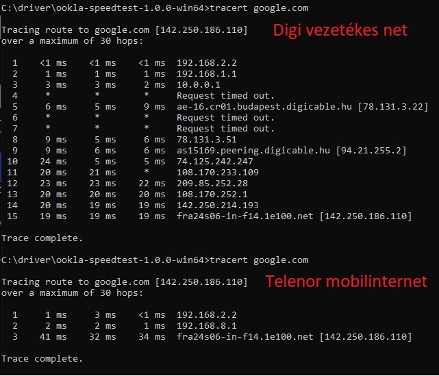 Az biztos, hogy valami a Diginél se ok, mert kriminális ez a sok timeout. Mobilinterent meg gyors, még a ping is normális és nem járja be a csomag a fél világot.