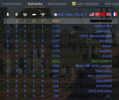 Az előbb a berlini pályán a C pont felől lőttük az éledési pontról kijövő tankokat. Egy KPz, egy MBT, egy T64A és két M1 Abrams. Kijött egy T64B, bement egy sittkupac mögé, ami épphogy takarta a hasát és lőni kezdett minket. Nem rejtőzött el, kint állt nyugodtan a placcon, úgy darálta le az egész csapatot előttem. Aztán kirongyolt a sittkupac mögül és engem is kivégzett, majd elfoglalta a C pontot.