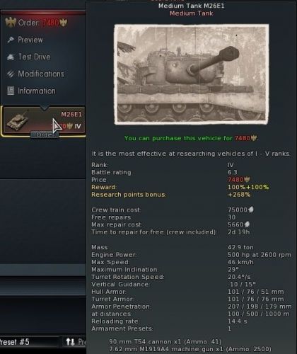 A löveg miatt. Csak APCBC lövedéke van ami nem robban. Azoknak meg pont most vették le max 10%-ra az esély hogy berobbantsa az ammot ha azt lövöd meg, és elvileg a benzintankot sem gyújtja ki. Ja és persze még a reload is hosszabb. Az átütése jobb, de arra a sima M26-nak is van APCR löszere.