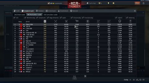 Nem beszélve arról hogy volt hogy géppuskával lőttek ki szemből, nem győztem takargatni azt a baszott nagy krátert a Torony jobb oldalán, nagyobbra már nem is csinálhatták volna.... Mostanában mentem vele, és Is6-ok ellen kellett mennem vele, meg sokszor Leopárdok ellen, ami nem nagy falat,ha te lősz előbb,de APDS-el ott lőtt be ahol nem akart...Én is rendszeresen +1br-el fentebb megyek, én abban a hitben vagyok hogy ez statisztikai alapon megy, érdekes dolog hogy kb 3 éve ugyan olyan winrate-val vagyok, valamikor lemegy 5%-ok,de átlagban mindig 65-70%(Object 906-os statom magáért beszél, és ha kb minden 3.-ik csatám a csapat miatt bukjuk azt hozzáadom, akkor ütné a 85%-ok)