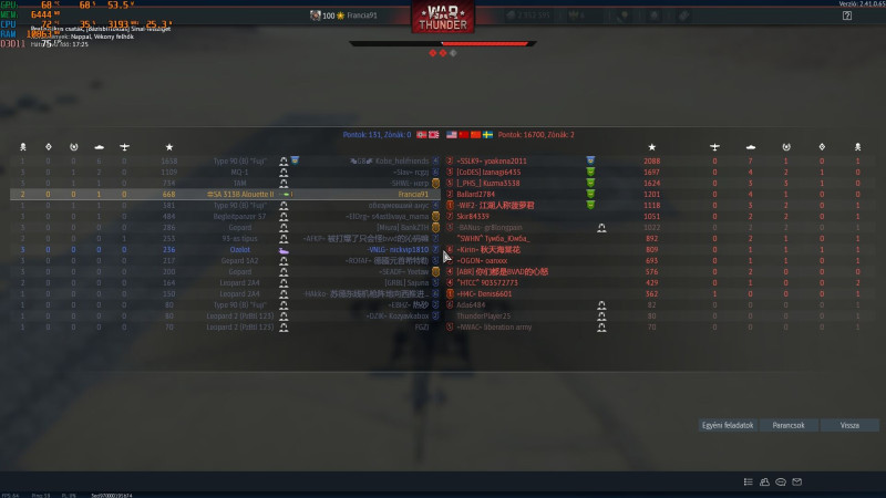 négy meccsből, a legjobb egy 12.-ik (igen, tizenkettedik) helyezés volt. Kettő 75%-os LB Boosterrel 6.7 svéd, aztán egy 4.0 a Thunderboltokkal és a Mustanggal, meg egy 5.7 német ... Úgy léptem ki mint a szél. De előtte még beírtam, hogy úgylátszik, ma semmit sem tehetek ebben a játékban. És a T2-es feladatot sem tudtam lehozni.Egyszerűen van ilyen : A játék felsetupolja azt, hogyha fejre állsz sem lesz semmilyen eredményed. PONT. Akkor én meg kilépek, ígyis néggyel többet játszottam ma mint kellett volna.