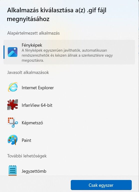 "Ha pedig a fájlra kattintok a társításhoz, akkor pedig csak a "Csak egyszer" opció választható ki, a "Mindig" nem"zugloipiknik