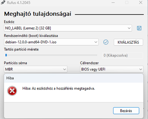 Ha az Etcher és a Fedora Media Writer is hibára fut, ami a Windows 11 újraindítása és másik USB-porton történő kipróbálása után is fennáll, akkor a pendrive-val vagy a szoftverkörnyezettel nem stimmel valami. Ha nem, akkor pedig Rufus specifikus probléma lehet, bár az utóbbi nem feltétlen általános, mivel pl. nálam gond nélkül kiírja naprakész Windows 11 22H2 (22621.1848) alatt a Linux képfájlokat a 4.1-es Rufus ISO és DD képfájl módban egyaránt.